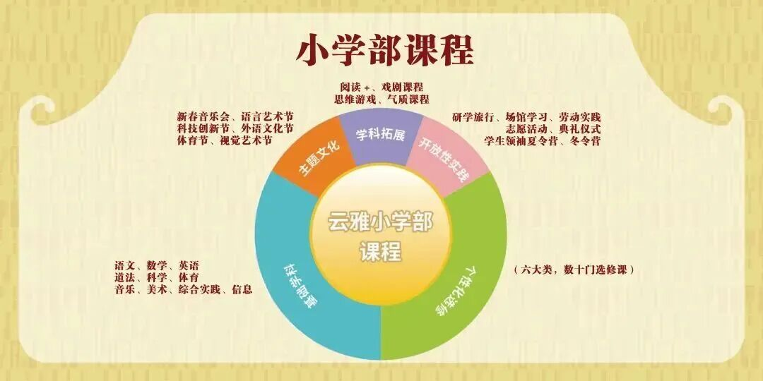 课程体系:构建了博雅冠冕课程、博雅精英课程、博雅素养课程、博雅个性课程、博雅融合课程、博雅拓展课程、研学旅行课程、综合实践课程等特色课程,满足不同层次学生的多样性需求。